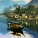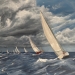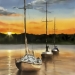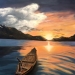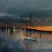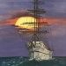 Een imposant schip vaart kalm de ondergaande zon tegemoet. De reflectie van het licht en de diepe kleuren van zee en lucht brengen rust en kracht samen.